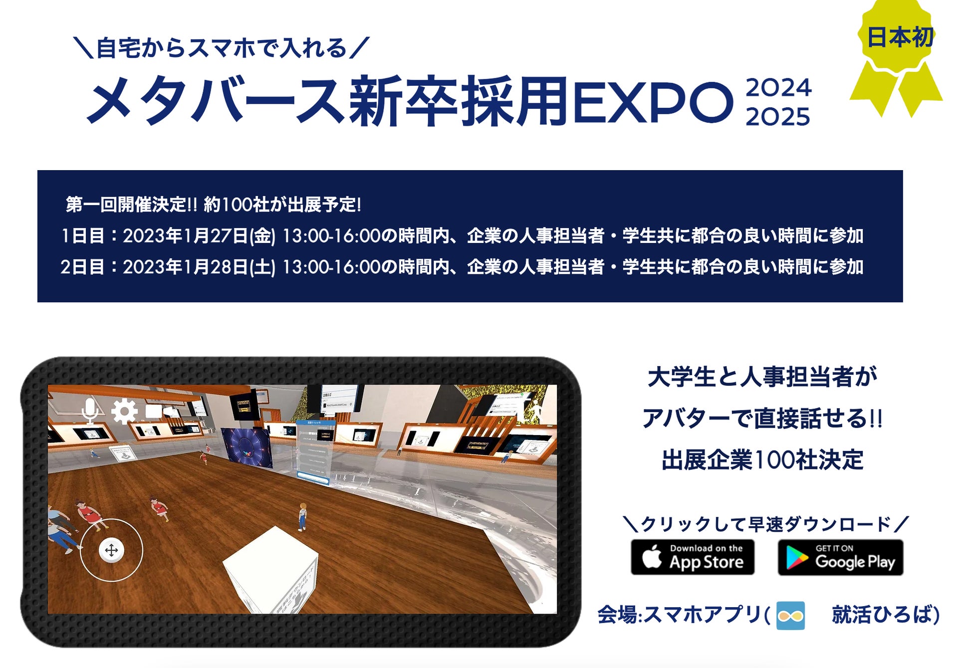 2023年1月27/28日(13-16時・入退出自由)に実施するメタバース採用EXPO2024・2025の会場が、"未来の就活"を提案するアプリ「就活ひろば」内での開催となりましたので、お知らせします