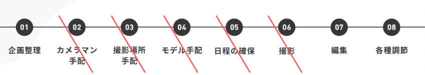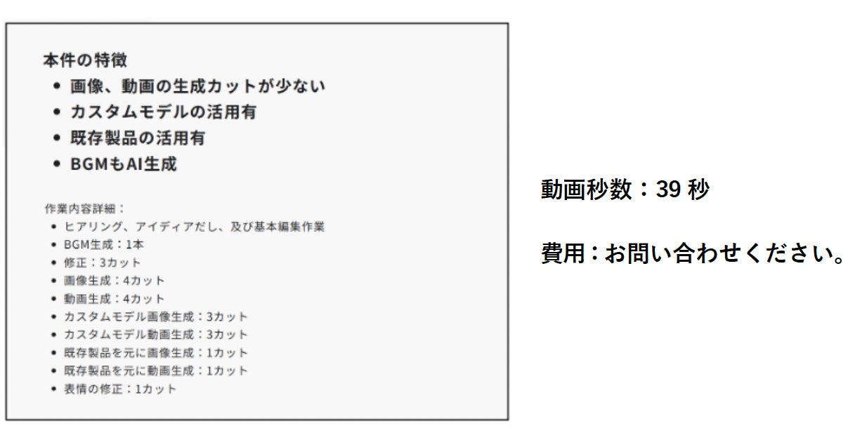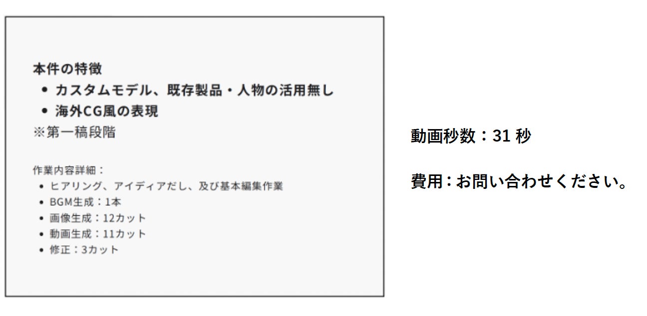 従来の映像制作では、モデルを起用する際のスケジュール調整、撮影現場・カメラマンの手配などの手間の多さに加え、制作期間の長さが課題となっています。また、簡単な動画でも100万円〜500万円、手の込んだ動画になると1000万円〜4000万円程のコストがかかります。一方で、AIを活用することにより撮影の中で発生する各種手配や調整など手間のかかるステップを省き、従来よりもスピーディかつリーズナブルな制作が可能となります。